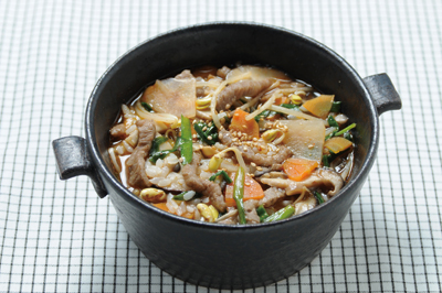 | (2) | 鍋にごま油、にんにくを入れて熱し、牛肉を炒め、大根、人参、しいたけ、豆もやしをいれて炒め、Aを加えて煮立てる。 |