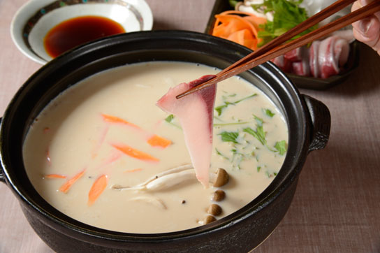| (2) | 鍋にAを入れて沸騰しないように温め、(1)を入れてしゃぶしゃぶし、ポン酢につけていただく。 |
