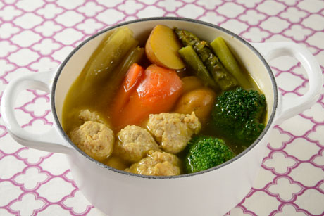 | (1) | たまねぎはみじん切りにして、鶏挽肉・卵・塩・こしょうを混ぜ、一口大に丸めて団子にする。じゃがいもは半分に切り、にんじん・セロリ・アスパラガスは4等分、ブロッコリーは小房に分ける。 |