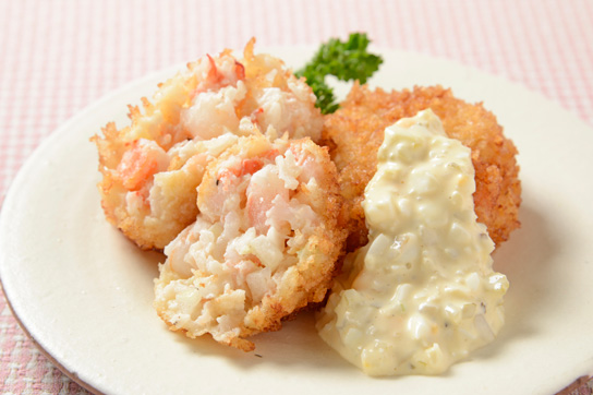 | (3) | むきえび・残りのたまねぎ・マヨネーズ・塩・こしょうを混ぜ、8等分にして丸める。冷蔵庫で30分程冷やしてから小麦粉・溶き卵・パン粉の順に衣をつける。 |