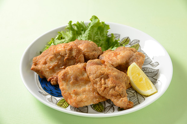 | (2) | (1)を鶏肉と煮汁に分ける。煮汁150ccとBを良く混ぜて鶏肉にまぶし、170℃の油で揚げ色がつくまで揚げ、グリーンリーフ・レモンを飾る。 |