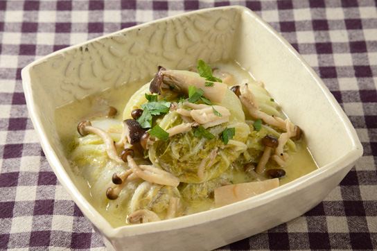 | (2) | 白菜に混ぜ合わせた肉種をのせて巻き、鍋に並べ、水・コンソメ・きのこ類を加えて蓋をし、15分程煮込む。 |